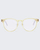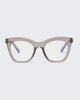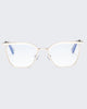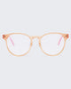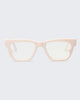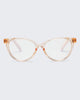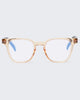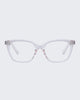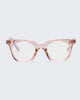 In glossy translucent pink tint, THE ACHES OF MATH is a soft cat-eye frame with metal hinge and features our signature blue-light lens with magnifications.